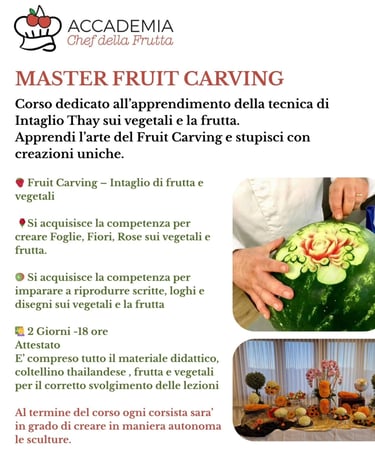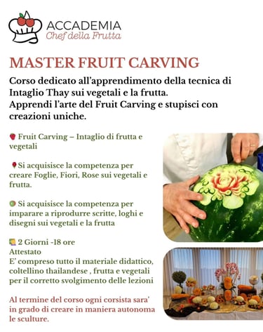I nostri corsi master fruit sull'intaglio vegetale ti sveleranno i segreti per trasformare frutta e verdura in creazioni artistiche, perfette per stupire e deliziare i tuoi clienti. Imparerai a utilizzare, gestire e decorare i prodotti ortofrutticoli con maestria, elevando il tuo lavoro o la tua attività a un livello superiore.