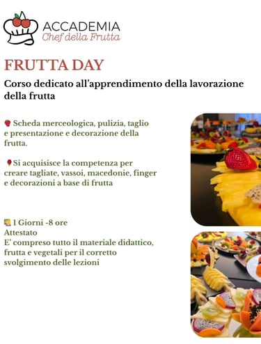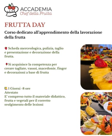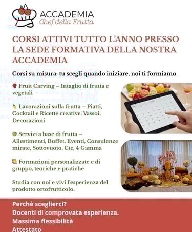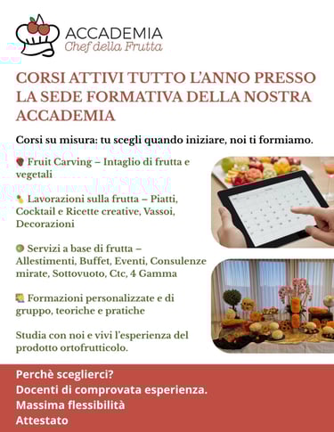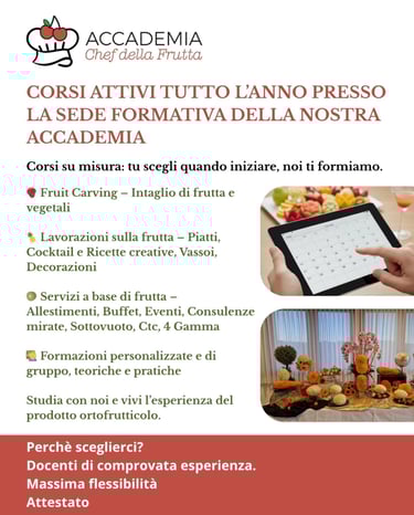 Immergiti in un'esperienza formativa unica con i nostri corsi di formazione sull'ortofrutta, progettati per trasformare la tua passione in competenza. L'Accademia Chef della Frutta ti offre percorsi completi, dai fondamenti alle tecniche più avanzate, per diventare un vero esperto del settore.