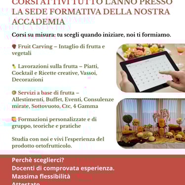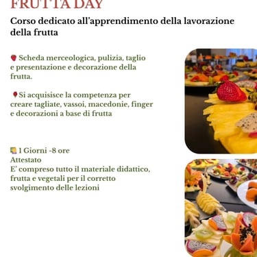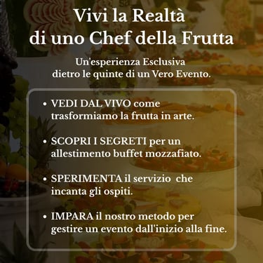 Presso la nostra sede formativa, attiva tutto l'anno, potrai apprendere il metodo completo per gestire un evento mozzafiato: dalle tecniche avanzate di Fruit Carving (intaglio di frutta e vegetali) alla creazione di piatti, cocktail e ricette creative per vassoi e decorazioni. La formazione è totalmente flessibile e personalizzabile, disponibile sia per singoli che per gruppi, con un approccio che fonde teoria e pratica sul campo. Scoprirai i segreti del "dietro le quinte" di un vero evento, imparando a gestire allestimenti, consulenze mirate e tecniche moderne come il sottovuoto e la IV gamma. Studia con docenti di comprovata esperienza e ottieni un attestato che certifica la tua maestria nel settore.