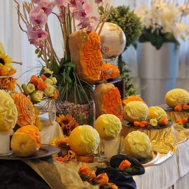 Trasforma la mise en place del tuo evento in un giardino d'arte. Questo pacchetto è dedicato alla progettazione e realizzazione di decorazioni botaniche per i tavoli, dove frutta e verdura diventano elementi di design raffinato, sostituendo o integrando i classici fiori con colori e profumi autentici.