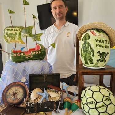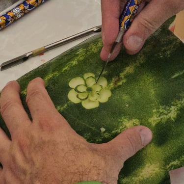 Il fulcro dell’esperienza è il lavoro di intarsio manuale su grandi frutti come angurie, meloni e zucche, trasformati in vere opere d'arte decorative.