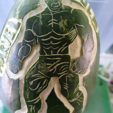 Intarsio manuale artistico su grandi frutti (angurie, meloni, zucche), includendo anche nomi e loghi dei protagonisti