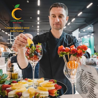 Show cooking scenografico e animazione d'autore: il Maestro Alessio Lanaro trasforma la frutta in spettacolo.