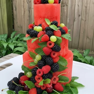 Torte di Frutta Scenografiche: Creazioni monumentali di sola frutta fresca, pronte per il taglio o l'esposizione.